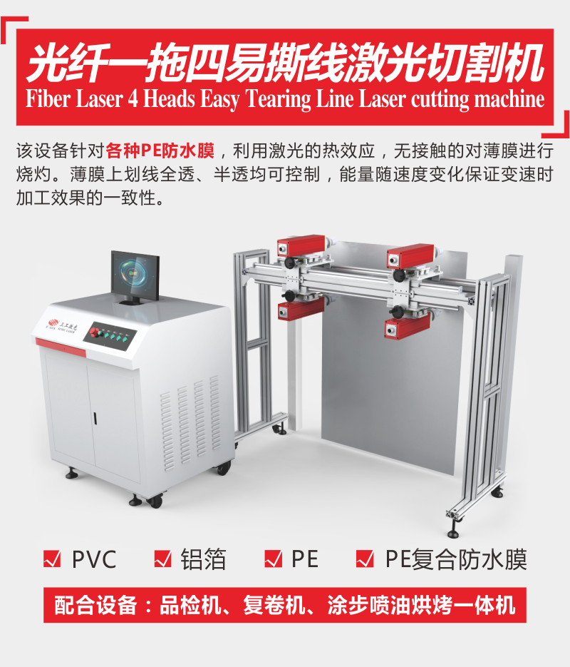 該設(shè)備針對各種PE防水膜,利用激光的熱效應(yīng),無接觸的對薄膜進(jìn)行燒灼。薄膜上劃線全透、半透均可控制,能量隨速度變化保證變速時(shí)加工效果的一致性。